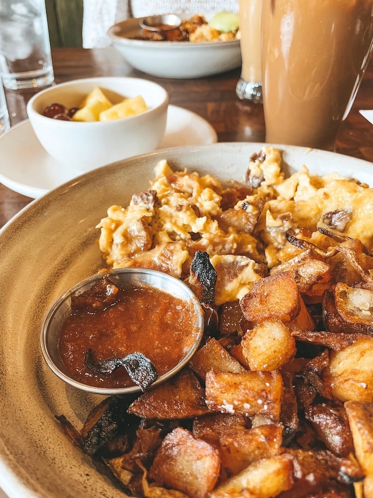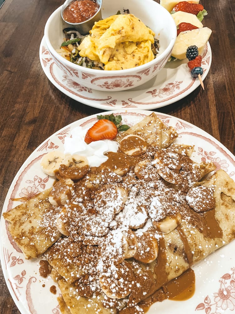 At Eggstacy, you’ll find a wide range of options on the menu, including benedicts, omelets, pancakes, waffles, skillets, crepes, and more. They definitely have one of the largest menus of all the brunch spots on this list. Personally, I’ve been here a few times, and the best thing I’ve ordered (hands down!) is the Cookie Butter Crepe. Though it’s pretty sweet, it’s what I’ll always order from here because it is so delicious — be sure to try it!