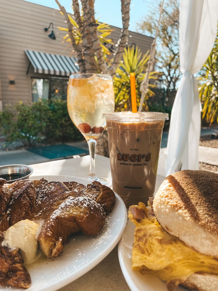 Luci’s serves breakfast from 7 AM – 3 PM and has a full-service espresso bar. The Funky Monkey French Toast is my favorite thing to get here (it’s sooo good), and while I usually an iced coffee with my breakfast, I did try the white sangria here, and it was amazing! I took a sip of my husband’s, and I liked it so much I went to order one of my own.