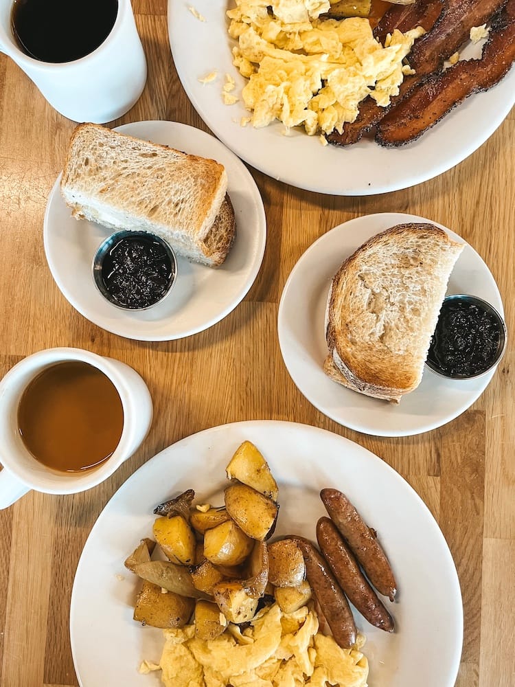 What makes Matt’s unique is their commitment to using honest ingredients, like cage-free eggs, grain-fed pork, and local produce. We pretty much always order The Hog & Chick, which comes with two eggs, thick-cut bacon or country sausage (both are amazing options), potatoes, and sourdough toast with butter and jam. The reason we always get this? It is so good. If you’re looking for a savory breakfast that will leave you feeling full — head to Matt’s Big Breakfast!