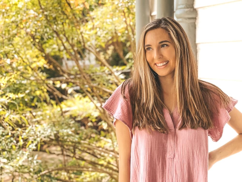 Travel by Brit standing in a pink dress on the porch of Biscuit Love, one of the best places to eat in Franklin, TN