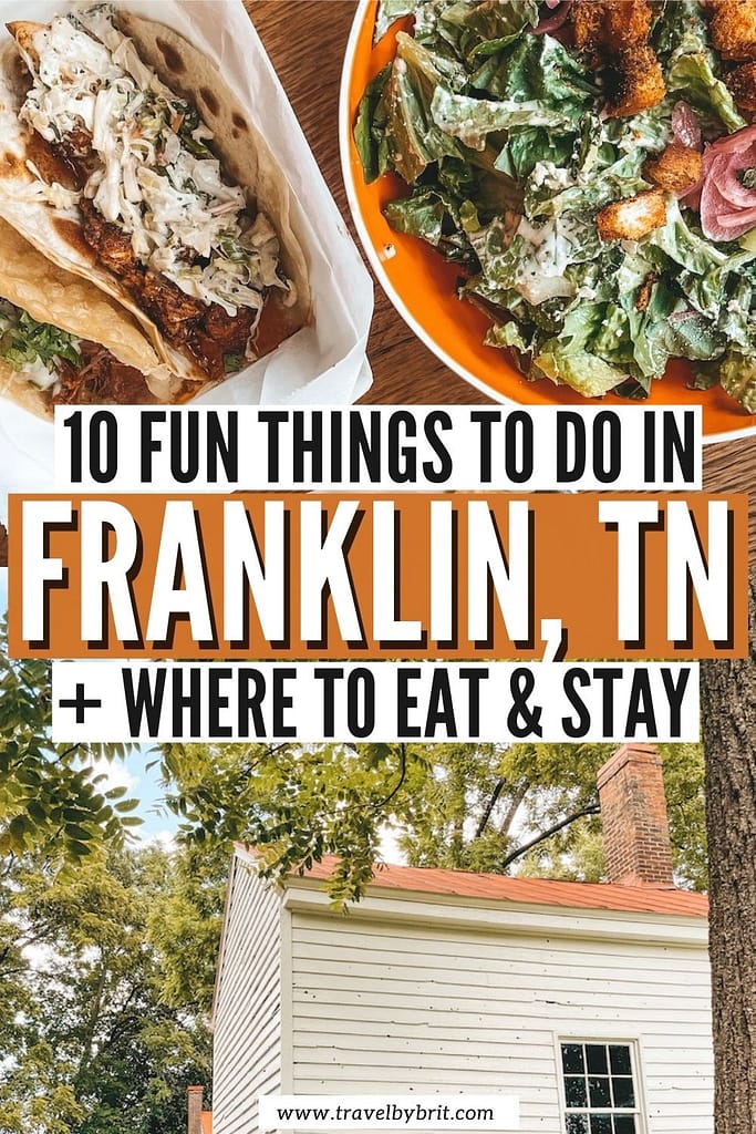 There are tons of ways to spend a jam-packed day in Franklin, TN! I would recommend starting off the day with breakfast at Biscuit Love, spending the morning exploring Downtown Franklin, touring either Carter House or Carnton to learn more about the Battle of Franklin and the Civil War, grabbing lunch and doing some shopping at The Factory at Franklin, spending the afternoon either in Leiper’s Fork or at Arrington Vineyards, and heading back into town for dinner at Puckett’s Restaurant & Grocery before returning to Nashville, Tennessee!