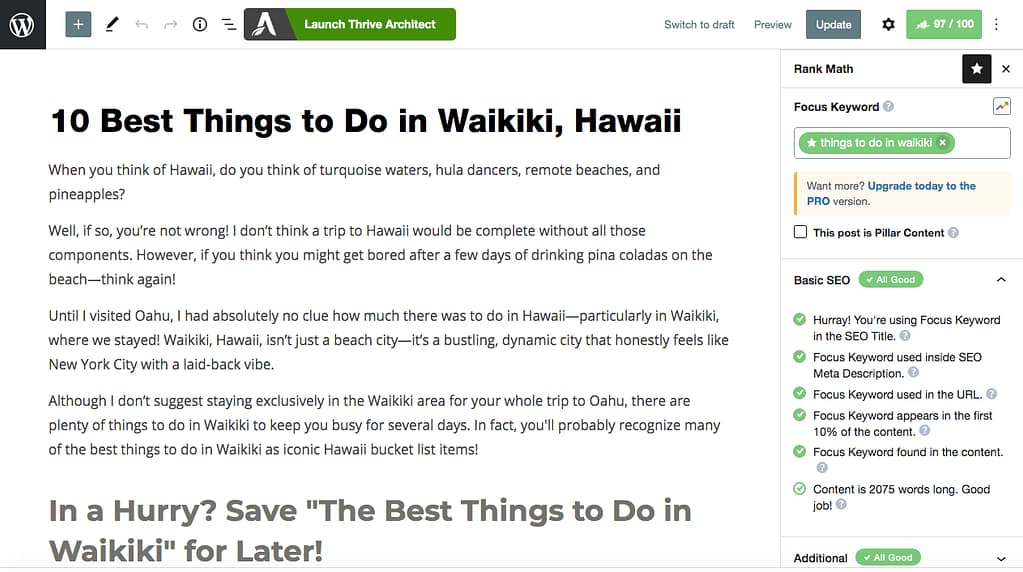These are my general best practices for writing SEO-friendly blog posts. If you’re using RankMath while writing, they will scan your post for many of these elements and also give you tips to improve your content.