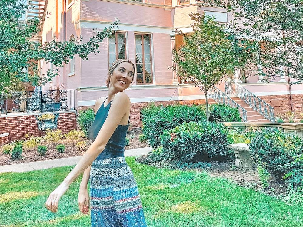 Weekend in Louisville - Woman twirling in front of large pink Victorian-style house - Travel by Brit