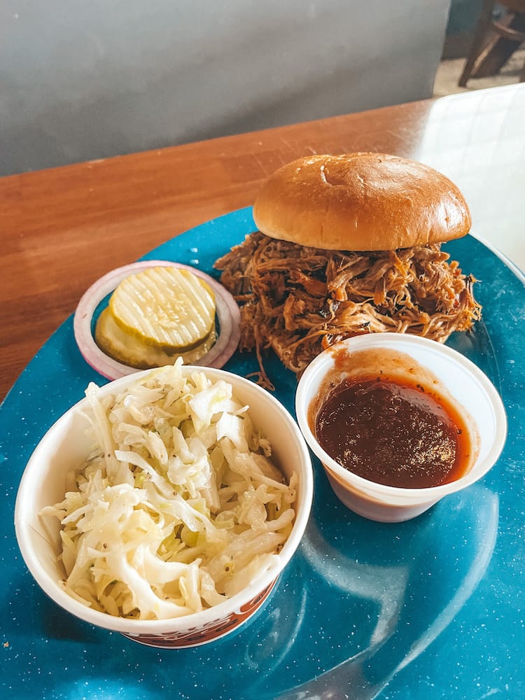 • Feast BBQ—If you’re looking for something heavier, head to Feast BBQ for lunch. This local chain restaurant serves smoked meats, like brisket, pulled pork, and chopped chicken, with several made-from-scratch sides, like beans and vinegar slaw!